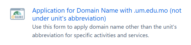 To apply Domain Name using the unit abbreviation as domain name under “um.edu.mo” or under the existing sub-domain of unit, please access IT Services Management System to submit the application form.